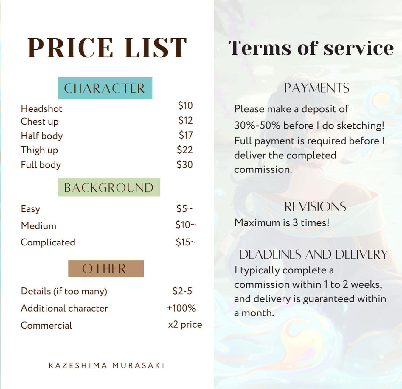 - Please make a deposit of 30%-50% before I do sketching!